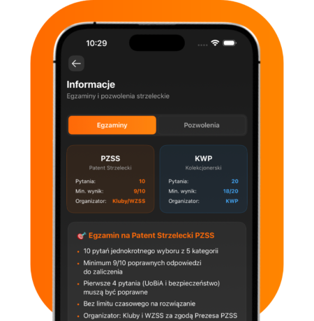Kompas Strzelecki to praktyczna aplikacja do skutecznego przygotowania do egzaminów: patentu strzeleckiego PZSS, egzaminu kolekcjonerskiego oraz dopuszczenia do posiadania broni (KWP). Koncentrujemy się na tym, by nauka była szybka, uporządkowana i zgodna z wymaganiami egzaminacyjnymi — bez obiecywania „skrótów”.